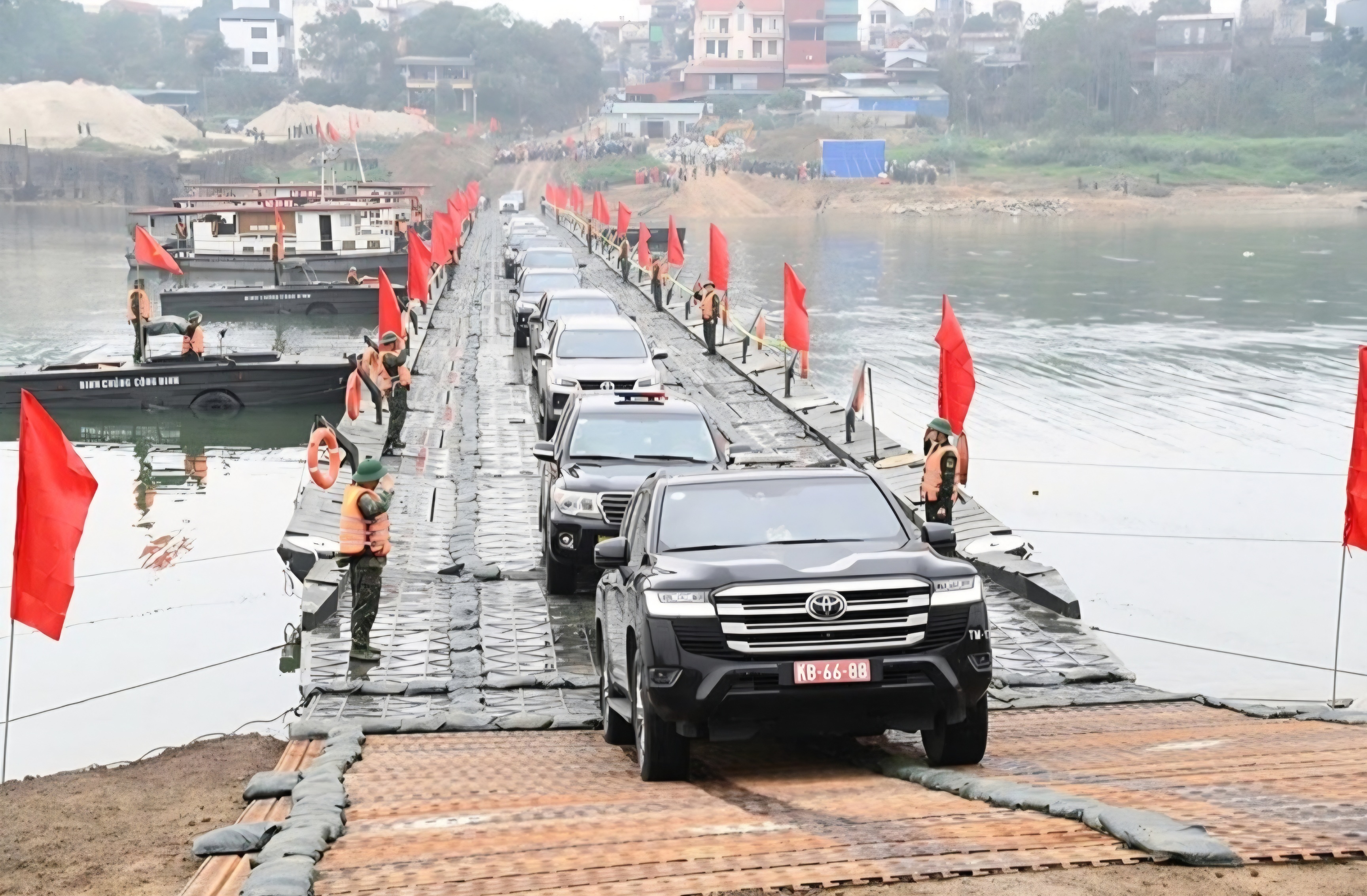 Cầu phao bắc qua sông Lô được thông xe ngay trong sáng 16/2 (ngày 29 Tết), sớm hơn yêu cầu Thủ tướng Chính phủ giao. (Ảnh: Báo Quân đội nhân dân)